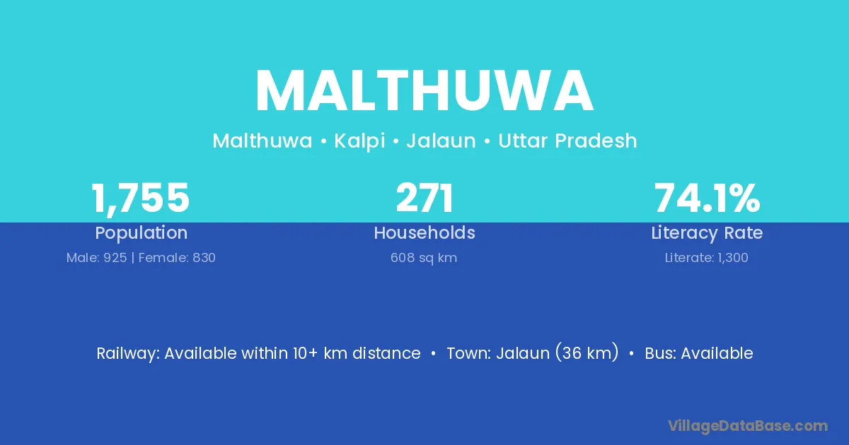 Jalaun (36 km) is the nearest town to Malthuwa village for major economic activities and is located approximately 36 km away.