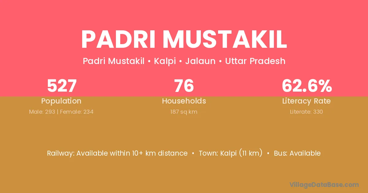 Kalpi (11 km) is the nearest town to Padri Mustakil village for major economic activities and is located approximately 11 km away.