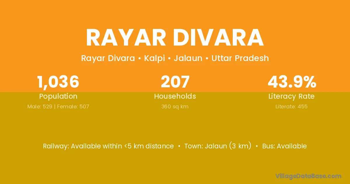 Jalaun (3 km) is the nearest town to Rayar Divara village for major economic activities and is located approximately 3 km away.