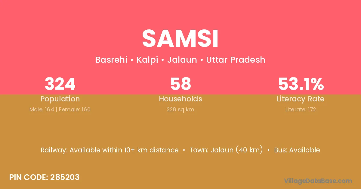 Jalaun (40 km) is the nearest town to Samsi village for major economic activities and is located approximately 40 km away.