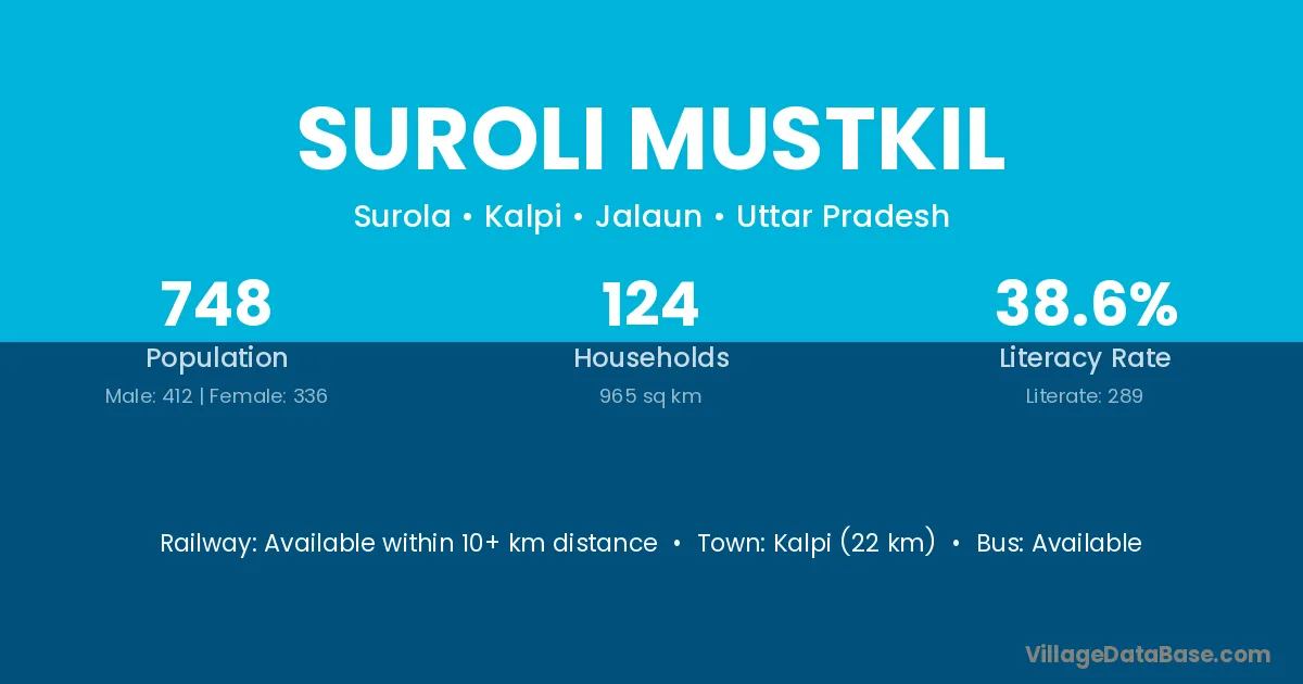 Kalpi (22 km) is the nearest town to Suroli Mustkil village for major economic activities and is located approximately 22 km away.