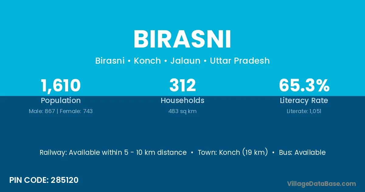 Konch (19 km) is the nearest town to Birasni village for major economic activities and is located approximately 19 km away.