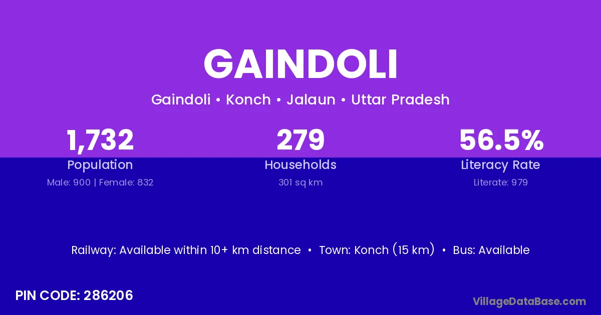 Konch (15 km) is the nearest town to Gaindoli village for major economic activities and is located approximately 15 km away.