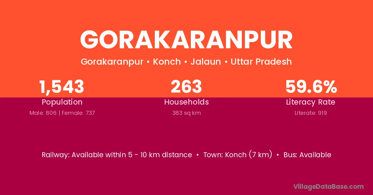 Konch (7 km) is the nearest town to Gorakaranpur village for major economic activities and is located approximately 7 km away.