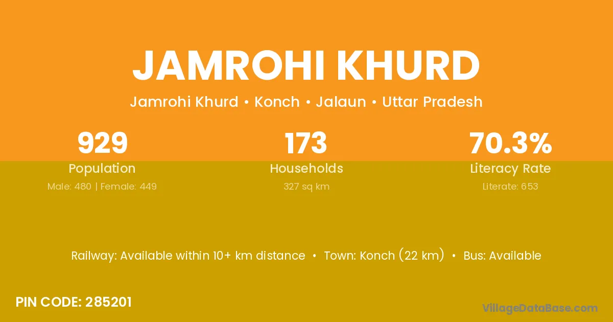 Konch (22 km) is the nearest town to Jamrohi Khurd village for major economic activities and is located approximately 22 km away.
