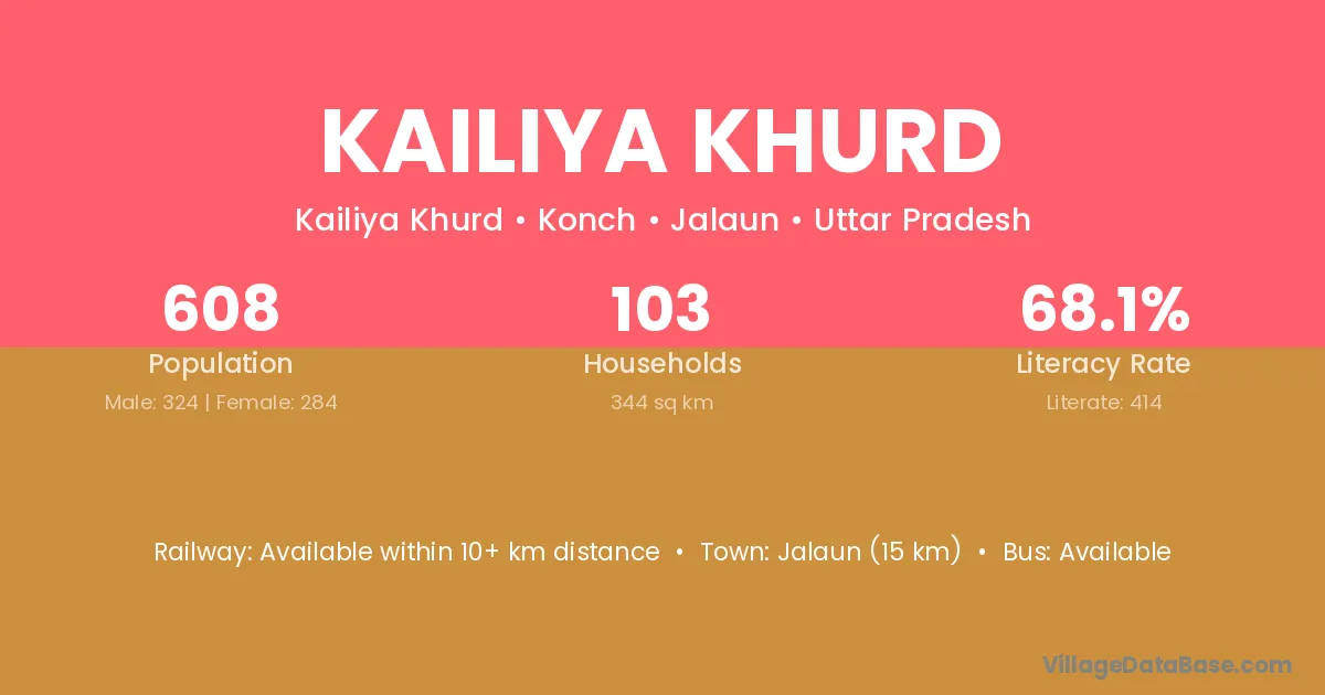 Jalaun (15 km) is the nearest town to Kailiya Khurd village for major economic activities and is located approximately 15 km away.