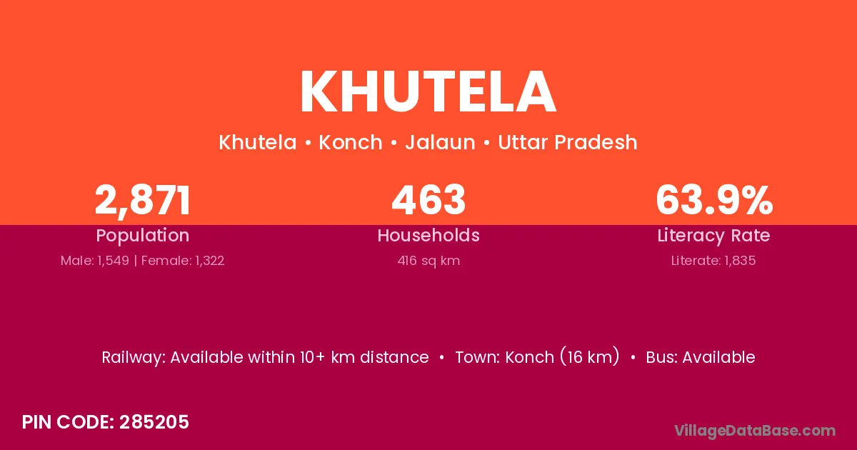 Konch (16 km) is the nearest town to Khutela village for major economic activities and is located approximately 16 km away.