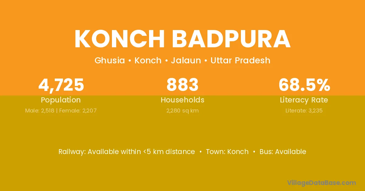 Konch Badpura village has a total population of 4,725 people, of which 2,518 are males and 2,207 are females.