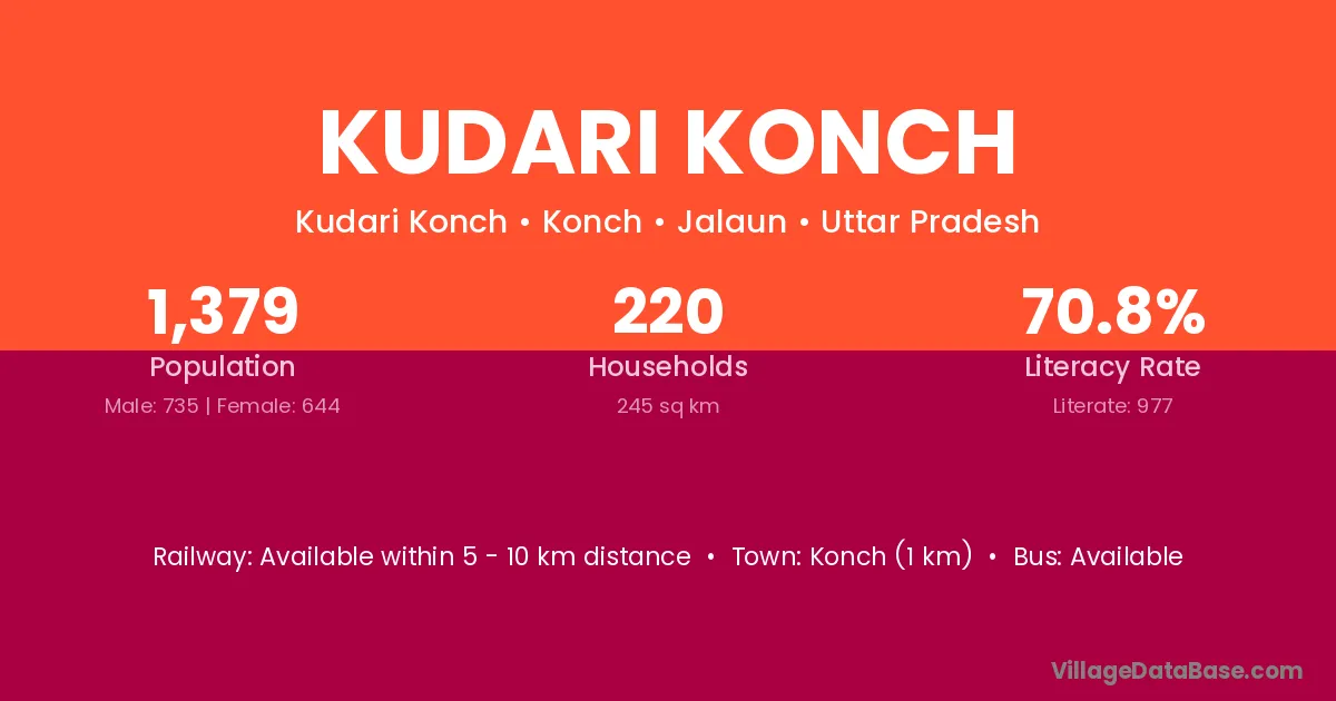 Konch (1 km) is the nearest town to Kudari Konch village for major economic activities and is located approximately 1 km away.