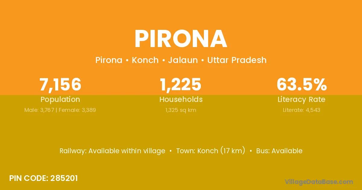 Konch (17 km) is the nearest town to Pirona village for major economic activities and is located approximately 17 km away.