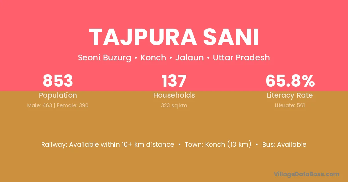 Konch (13 km) is the nearest town to Tajpura Sani village for major economic activities and is located approximately 13 km away.