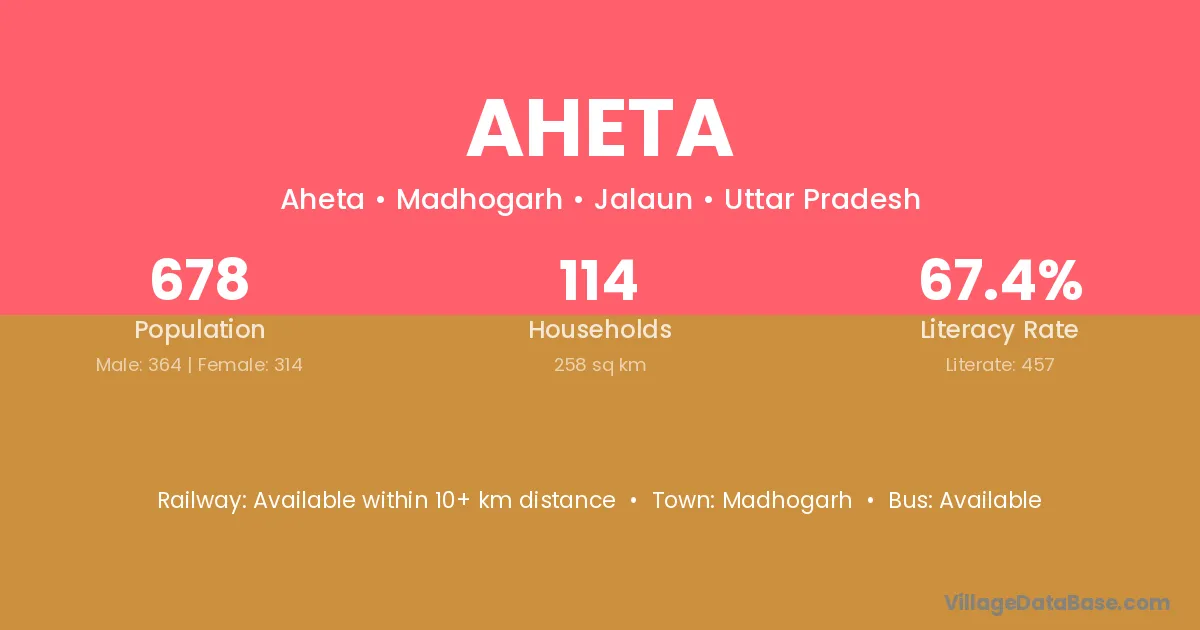 Aheta village has a total population of 678 people, of which 364 are males and 314 are females.