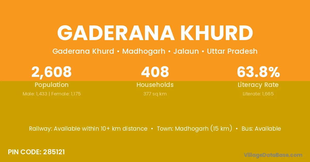 Madhogarh (15 km) is the nearest town to Gaderana Khurd village for major economic activities and is located approximately 15 km away.