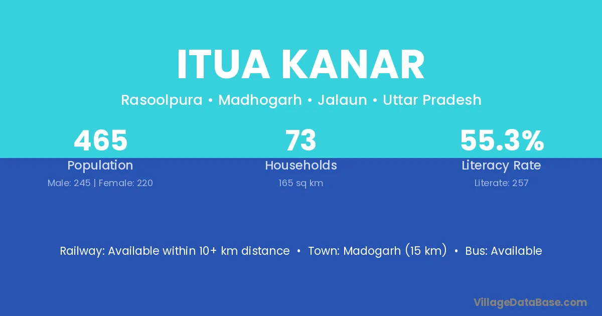 Madogarh (15 km) is the nearest town to Itua Kanar village for major economic activities and is located approximately 15 km away.