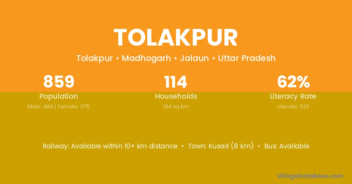 Tolakpur village has a total population of 859 people, of which 484 are males and 375 are females.