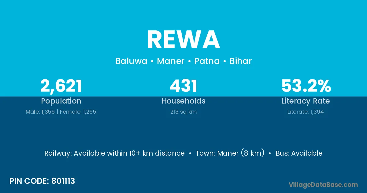 The literacy rate of Rewa village is 56.64%. Male literacy stands at 65.95% and female literacy at 45.69%.