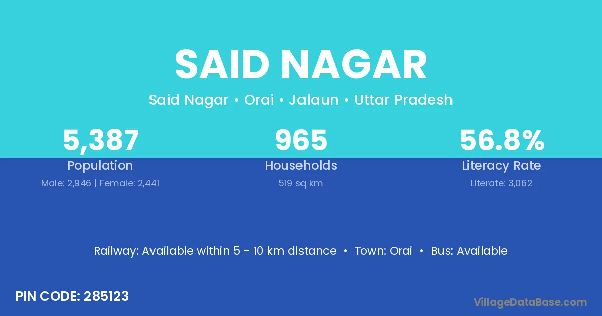 Said Nagar village has a total population of 5,387 people, of which 2,946 are males and 2,441 are females.