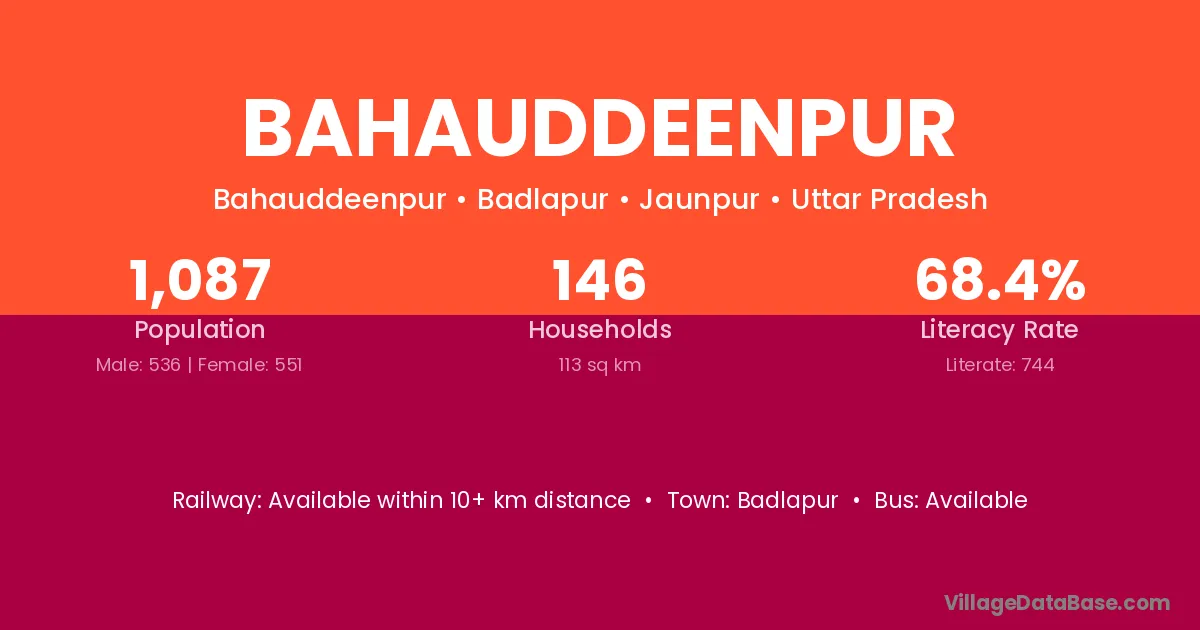Bahauddeenpur village has a total population of 1,087 people, of which 536 are males and 551 are females.