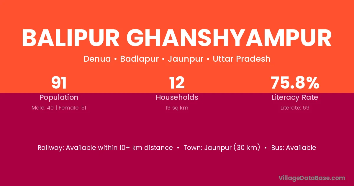 Jaunpur (30 km) is the nearest town to Balipur Ghanshyampur village for major economic activities and is located approximately 30 km away.