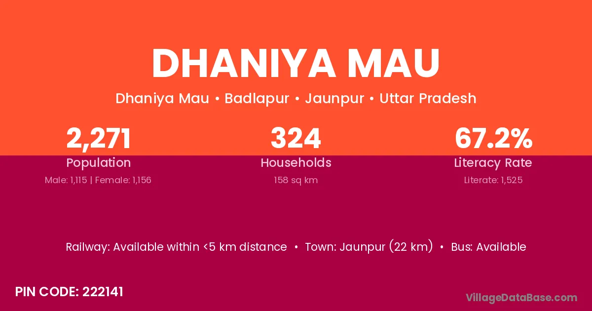 Jaunpur (22 km) is the nearest town to Dhaniya Mau village for major economic activities and is located approximately 22 km away.