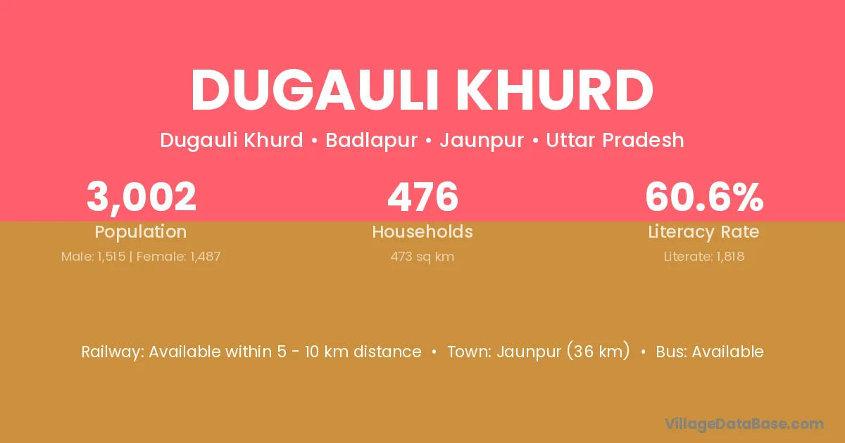Dugauli Khurd village has a total population of 3,002 people, of which 1,515 are males and 1,487 are females.