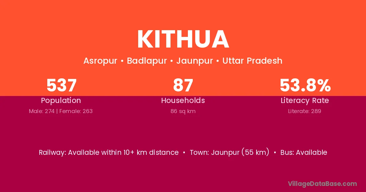 Kithua village has a total population of 537 people, of which 274 are males and 263 are females.