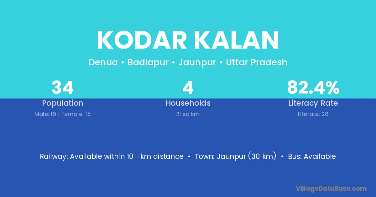 Jaunpur (30 km) is the nearest town to Kodar Kalan village for major economic activities and is located approximately 30 km away.