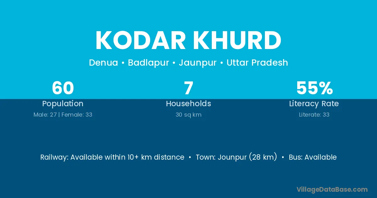 Jounpur (28 km) is the nearest town to Kodar Khurd village for major economic activities and is located approximately 28 km away.