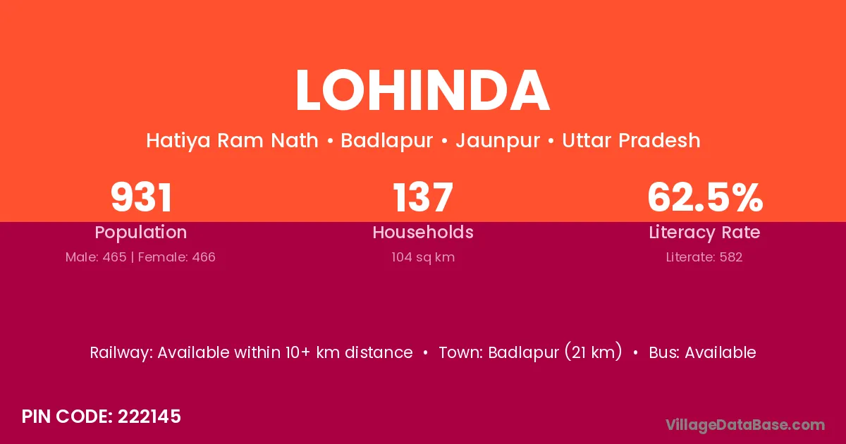 Lohinda village has a total population of 931 people, of which 465 are males and 466 are females.