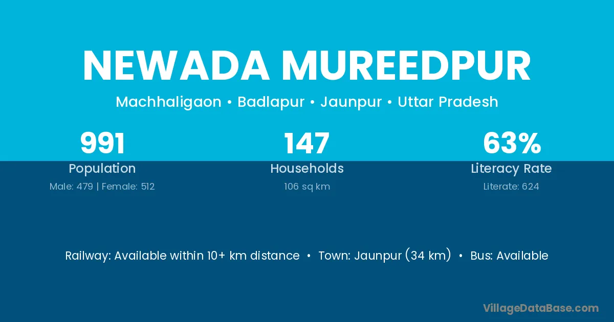 Jaunpur (34 km) is the nearest town to Newada Mureedpur village for major economic activities and is located approximately 34 km away.