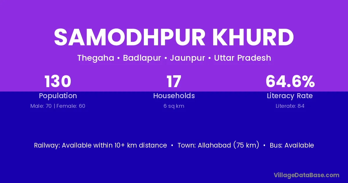 Allahabad (75 km) is the nearest town to Samodhpur Khurd village for major economic activities and is located approximately 75 km away.