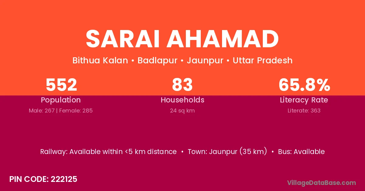 Jaunpur (35 km) is the nearest town to Sarai Ahamad village for major economic activities and is located approximately 35 km away.