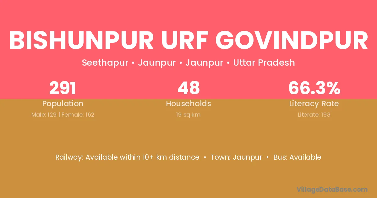 Bishunpur Urf Govindpur village has a total population of 291 people, of which 129 are males and 162 are females.