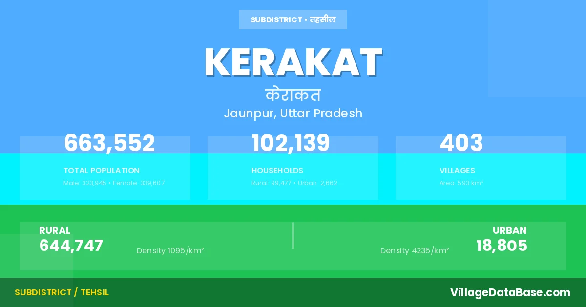 According to the 2011 census The total area of Kerakat Tehsil is 593 km², with a population of 663552 people. The population density is 1,118 inhabitants per square kilometre, and there are approximately 102139 houses in the sub district.