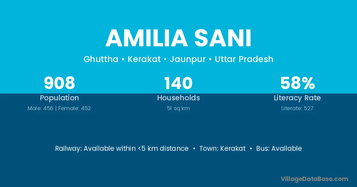 Amilia Sani village has a total population of 908 people, of which 456 are males and 452 are females.