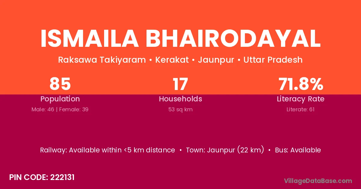 Ismaila Bhairodayal village has a total population of 85 people, of which 46 are males and 39 are females.