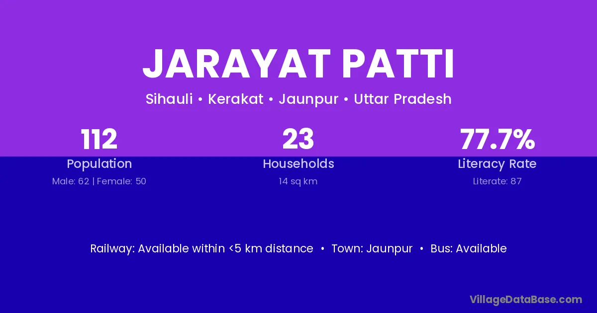 Jarayat Patti village has a total population of 112 people, of which 62 are males and 50 are females.