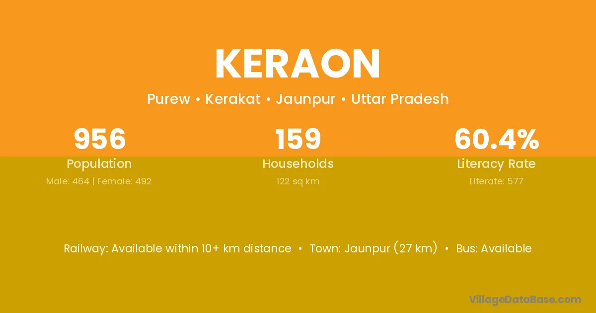 Jaunpur (27 km) is the nearest town to Keraon village for major economic activities and is located approximately 27 km away.