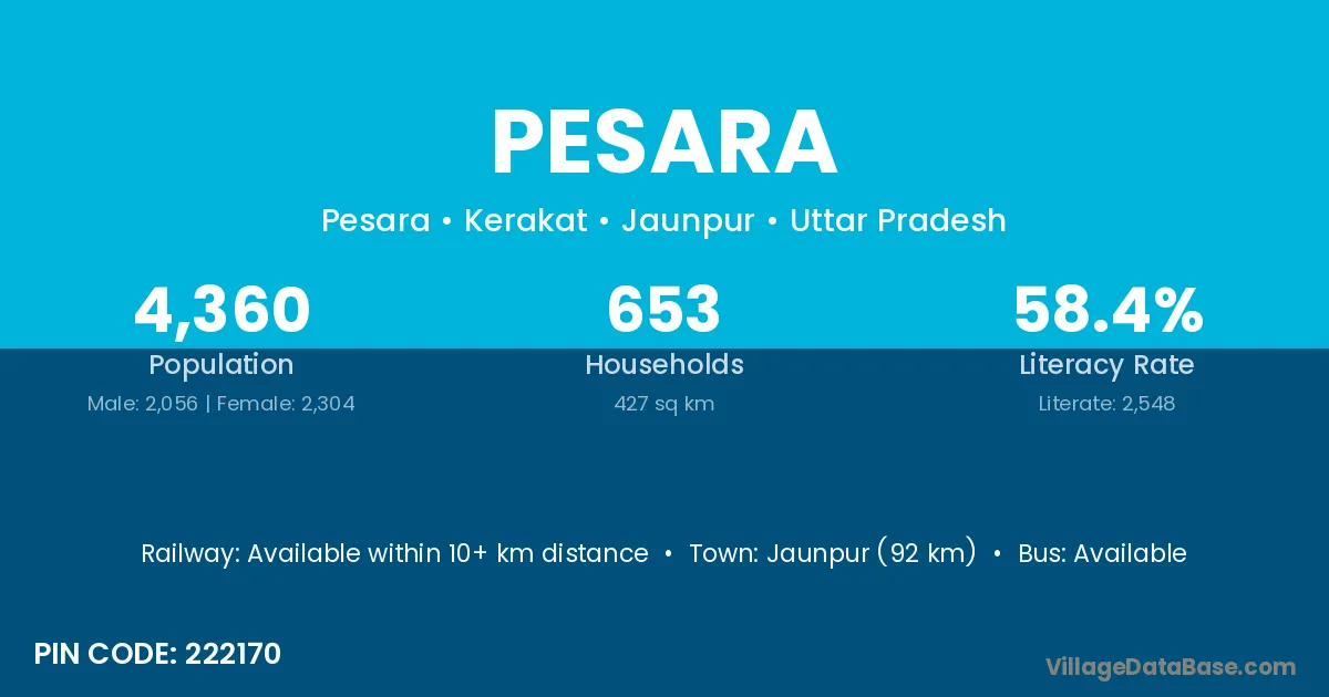 Jaunpur (92 km) is the nearest town to Pesara village for major economic activities and is located approximately 92 km away.