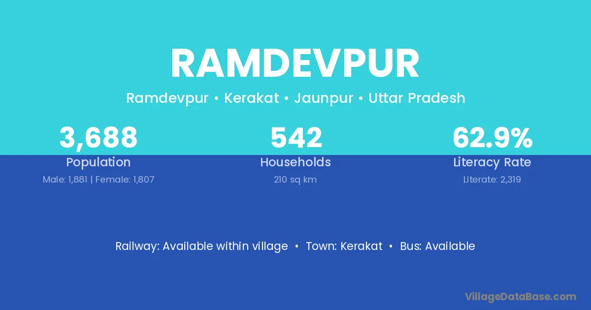 Ramdevpur village has a total population of 3,688 people, of which 1,881 are males and 1,807 are females.