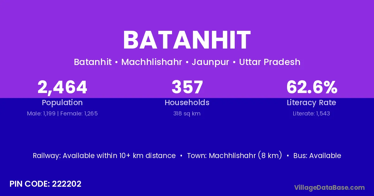 Machhlishahr (8 km) is the nearest town to Batanhit village for major economic activities and is located approximately 8 km away.