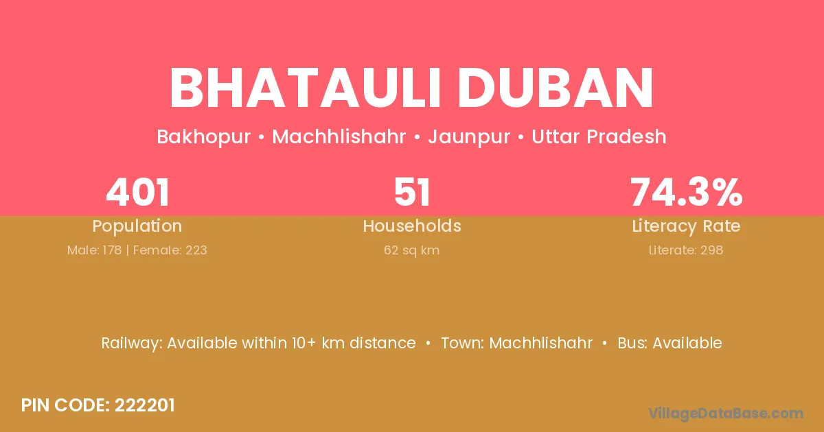 Bhatauli Duban village has a total population of 401 people, of which 178 are males and 223 are females.