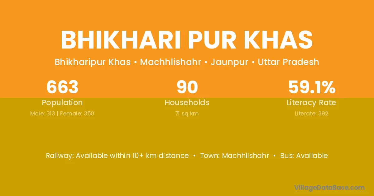 Bhikhari Pur Khas village has a total population of 663 people, of which 313 are males and 350 are females.