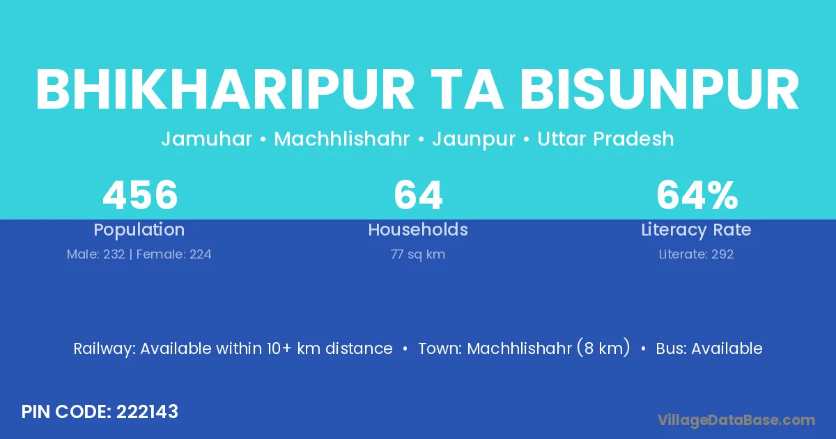 Machhlishahr (8 km) is the nearest town to Bhikharipur Ta Bisunpur village for major economic activities and is located approximately 8 km away.