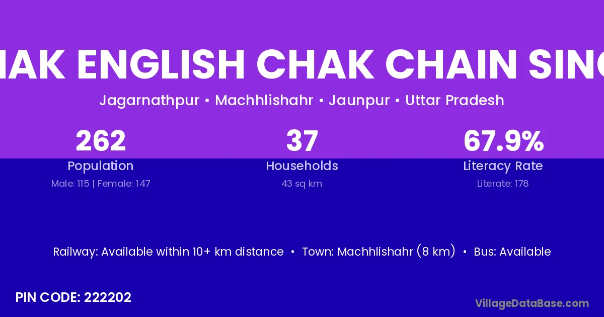 Machhlishahr (8 km) is the nearest town to Chak English Chak Chain Singh village for major economic activities and is located approximately 8 km away.