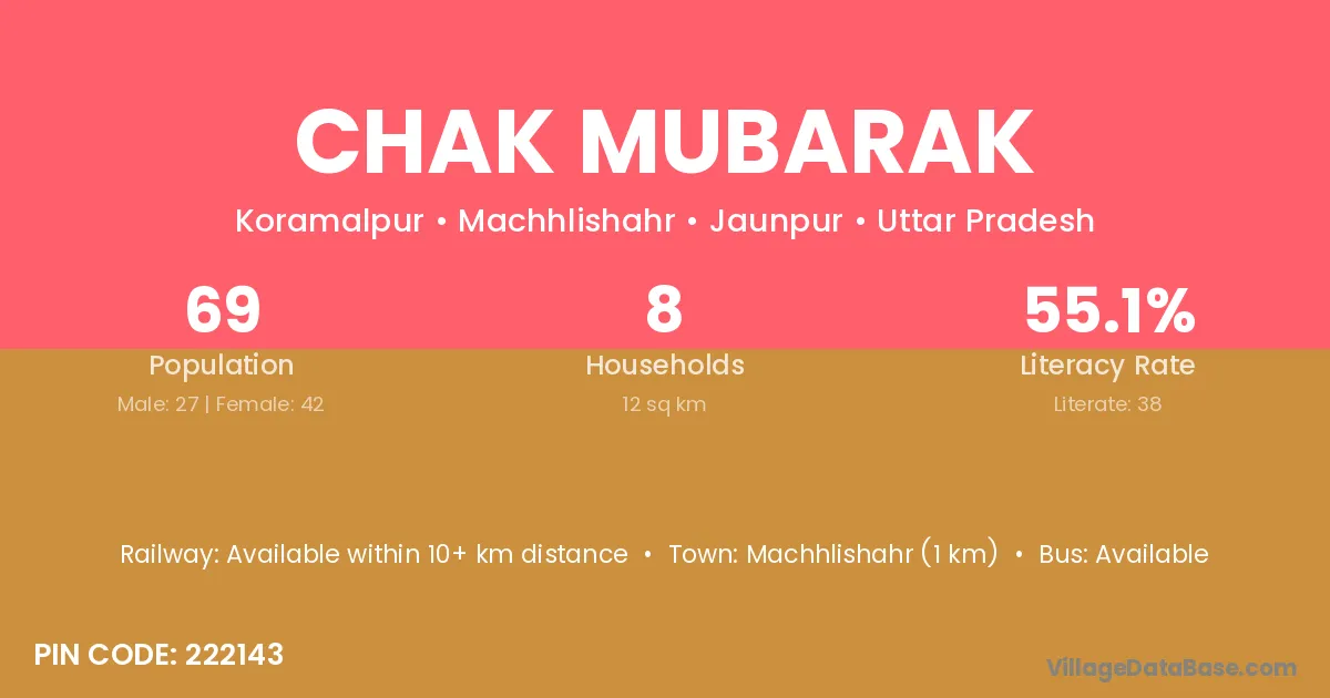 Machhlishahr (1 km) is the nearest town to Chak Mubarak village for major economic activities and is located approximately 1 km away.