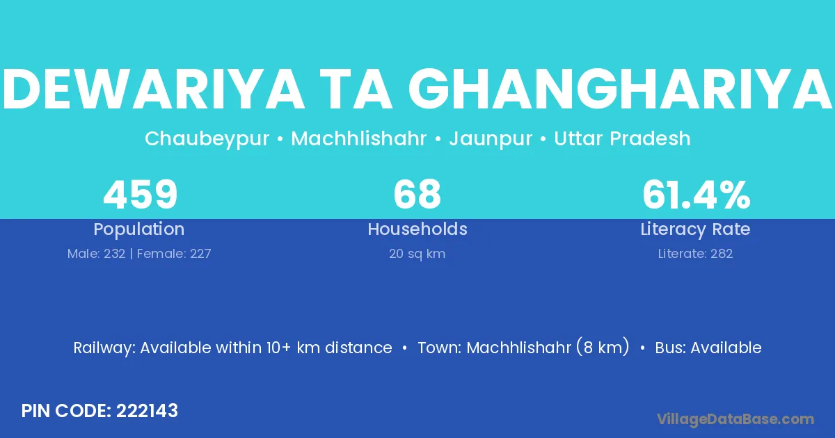 Machhlishahr (8 km) is the nearest town to Dewariya Ta Ghanghariya village for major economic activities and is located approximately 8 km away.