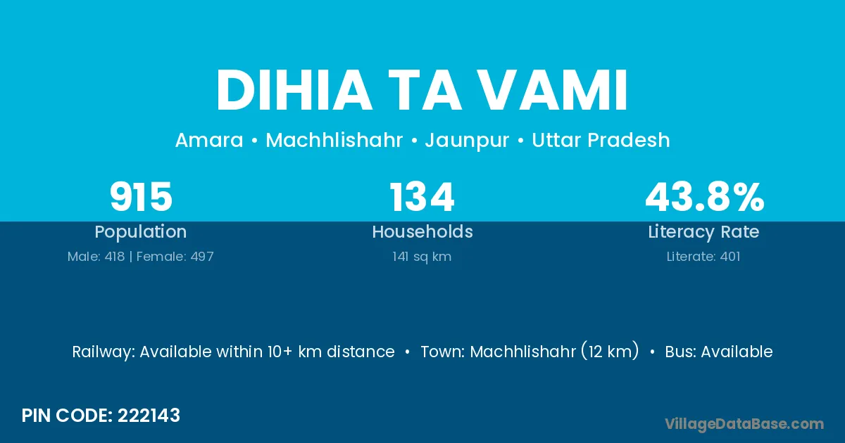 Machhlishahr (12 km) is the nearest town to Dihia Ta Vami village for major economic activities and is located approximately 12 km away.