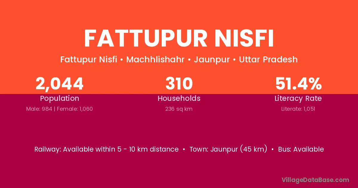 Jaunpur (45 km) is the nearest town to Fattupur Nisfi village for major economic activities and is located approximately 45 km away.