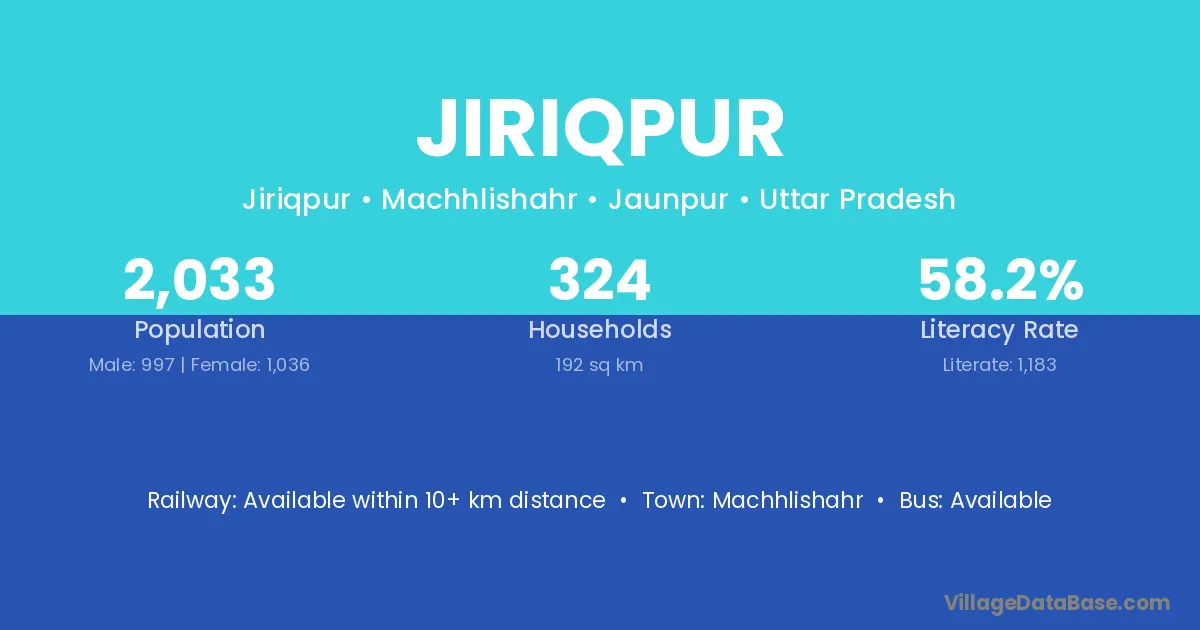 Jiriqpur village has a total population of 2,033 people, of which 997 are males and 1,036 are females.